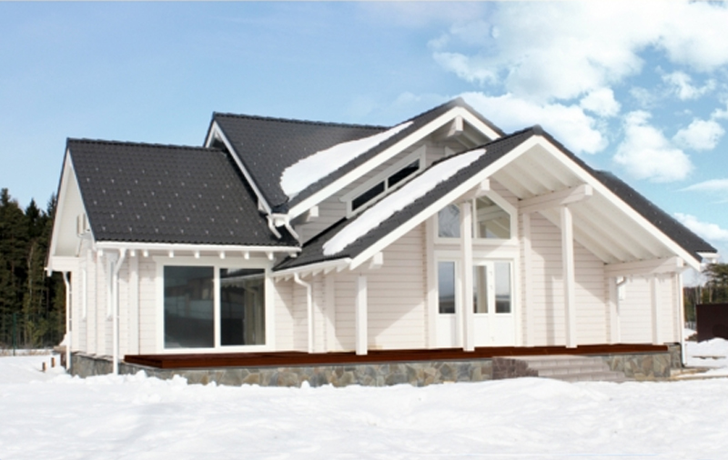 Этот белоснежный дом из клееного бурса — просторный дворец и настоящий шедевр! Контрастная покатая крыша эффективно контрастирует с фасадом строения.
