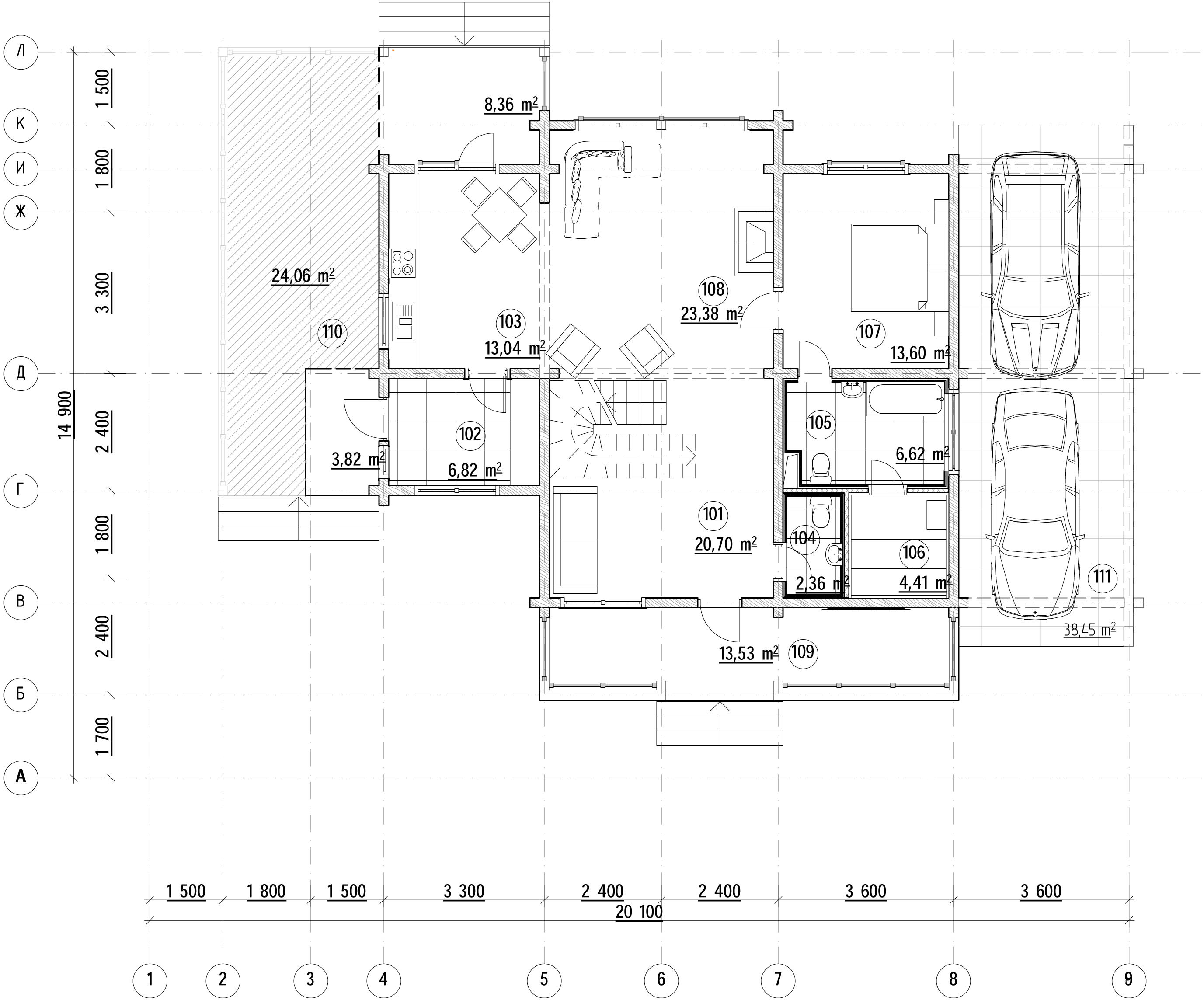 При планировке особое внимание уделено естественному освещению: значительное остекление, ориентация помещений на солнечные стороны света. Предусмотрена установка камина.