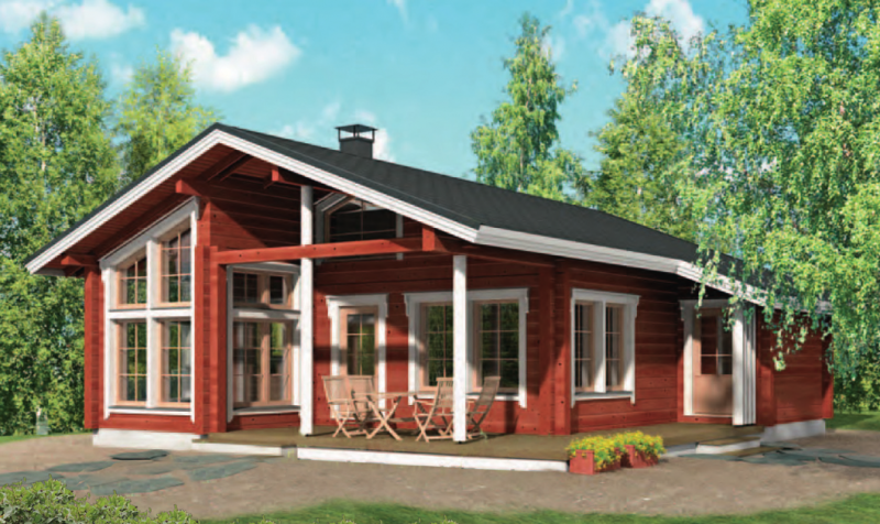 Этот белоснежный дом из клееного бурса — просторный дворец и настоящий шедевр! Контрастная покатая крыша эффективно контрастирует с фасадом строения.